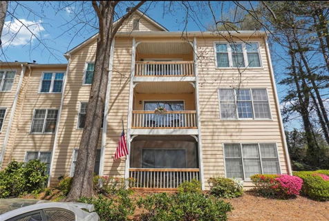 Say goodbye to stairs and hello to this large stepless cozy one story ranch condo with no carpet in sight. This Meticulously cared for three bedroom two bath home is tucked away offering tranquil privacy. Laminate flooring is throughout. The great room is showcased with a warm fireplace encased with two spaces for bookshelves to adorn and sliding glass doors that open to the balcony. Well appointed kitchen boasts tile flooring and ample cabinetry with a central island and gas range allowing more space to prepare and cook meals. The kitchen opens up to an eat-in area surrounded by windows creating a light and airy feel. The spacious primary suite offers a walk-in closet, a convenient vanity and private toilet, tub and shower. The two secondary bedrooms are rare in a condo and offer space and convenience. The updated hall bath is equipped with a modern vanity, toilet and tub with shower. The HOA offers some insurance, exterior maintenance, garbage, water and lawn care. Convenient to I285, hospital, shopping and grocery stores. Look no further, welcome home!