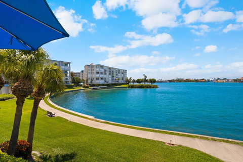 Welcome to Island Place at Harbourside. This first floor unit boasts panoramic views of the intracoastal which could be one of the top views in Harbourside, very private. Sit on your oversized private balcony and watch the dolphins, manatees, seasonal seabirds and yachts sail by. This 3bedroom 2bath has been tastefully updated throughout. Entering into the foyer you'll find wood-like laminate plank flooring throughout. The spacious 3rd bedroom/Den has a pocket door for privacy with an added closet perfect for condo living storage. The kitchen has eating space, new stainless steel appliances which include an induction stove, new cabinets with Granite countertops and an added pantry with cabinets beside it. The windows and sliders are all hurricane rated with new screens. AC replaced 2022 and hot water heater has been replaced at another time. Both bathrooms have Granite countertops, new cabinets, shower door and toilets. The master closet is updated with built ins, newer baseboards throughout, plantation shutters on the windows and sun filtering shades on all sliders. There is under bldg parking space 170 plus guest parking in front of bldg. Harbourside HOA fees include water, sewer, bldg. and flood insurances, cable, wifi, internet, trash, security and association maintained amenities. When Constructing Harbourside, JMC the contractor used Solid Steel reinforced concrete construction rather than hollow concrete blocks. Amenities include 6 swimming pools, 5 tennis courts with a Pickle ball courts, 2 fitness centers, Men and Women's Gyms, Jacuzzi, saunas, shuffleboard, outdoor grilling, 3 car wash station with vacuum & air, Car Charging station, Marina with 3 docks and 87 deeded slips. There is no deeded slip to this unit but there are slips available to rent or purchase from other owners. A Clubhouse with a full social agenda and a 1.5 mile walking trail around the island to exercise or walk your pet. Island Place allows owners one pet under 20 pounds. Come and enjoy Resort style living at it's best.