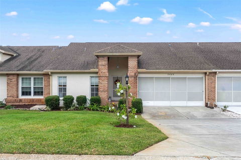 PENDING. LOCATION! LOCATION!! This meticulously maintained , tastefully FURNISHED Villa in AWARD WINNING TIMBER PINES original Model Center. Vaulted ceilings, 2 solar tubes, Engineered Hardwood Flooring provide OPEN CONCEPT LIVING perfect for entertaining. The beautiful enclosed lanai has a view of the STUNNING Paver rounded, terraced patio with panoramic view of lake and Golf Course. Just a short walk to the Lodge to enjoy all the amenities. The updated kitchen with NEW APPLIANCES, (except microwave) PANTRY, provides plenty of cabinet and counter space. The kitchen Nook affords gorgeous views to enjoy with your morning coffee. The Primary Bedroom has dual sinks, walk in shower, Solar Tube, and 2 Walk-In Closets. The Guest Bathroom has been updated and has tub shower combo. Indoor laundry. New Water Heater. HVAC 2011 - yearly maintenance program. 2016 EZ GO Golf cart, and charger (batteries 3 years old) 25 mph for sale outside contract. ENJOY THE GREAT LIFE TIMBER PINES has to offer, a gated 55+ Active Adult Community. Timber Pines boasts 4 PRISTINE Golf Courses, award winning pickle ball center, New state of the art Fitness/Wellness Center, Club House and Restaurant, Performing Arts Center, Residents Activity Center, 2 Geothermal Pools, Tennis, Billiards, Bocce, Wood Shop, Arts and Crafts Center, PAWS PARK for your pets. SO MANY ACTIVITIES with Over 100 Clubs. Spectrum Cable TV, 2 Boxes, and highest speed internet included in HOA fee. New buyer pays $2640 Capital Contribution to TPCA at closing. CALL TODAY!!!!