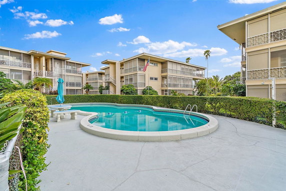 The building maintains hurricane impact-rated windows and doors for safety. Free on-street parking is available for guests. This community encourages comfortable living with low-maintenance options. A well-kept atmosphere supports a vibrant lifestyle in this active 55+ neighborhood.