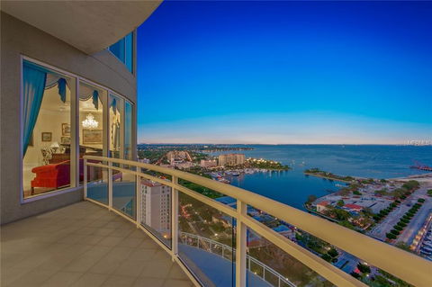 Now is your chance to live in an OVATION PENTHOUSE in downtown St Pete! Exquisite and spectacular are the only words to describe it! Step into the high-speed elevator and arrive at your private foyer that opens into a world of elegance and luxury. This condo is unique. It encompasses the entire floor and has curved, thermal-insulated, hurricane-impact windows which host a 360 DEGREE VIEW! There are three balconies from which to watch cruise ships and sail boats, fireworks and full moons.The formal living and dining rooms feature sparkling crystal chandeliers, elaborate crown molding and window treatment along with a full wet bar for entertaining. Notice the beautiful polished marble flooring throughout. As you walk through the intricate archway, a large, comfortable family room is open to the gourmet kitchen with high-end Wolf and Sub-Zero appliances. The cozy breakfast room off the kitchen has a balcony with an electric grill and amazing westward views. Both of the guest bedrooms have large ensuite baths with soaking tubs. The master suite is large enough to include a sitting area, plus a private balcony. You will be thrilled with the separate His and Her Master Bath suite with a large spa tub and large seamless glass shower. There’s more….your very own 3-CAR GARAGE PLUS an assigned parking space for yourself or guests. Call today to schedule your private viewing of this rare jewel on Beach Drive.