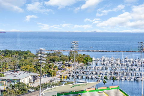 Designed to extend living beyond the interior, two private balconies are accessible from the living room, primary suite, and second bedroom, offering front-row views of Tampa Bay by day and the city's illuminated skyline by night. The primary suite is a private retreat featuring dual walk-in closets and a spa-level bath with an oversized soaking tub. A generously sized guest suite with its own walk-in closet ensures comfort and privacy, while the dedicated den adds flexibility for a home office or media space.