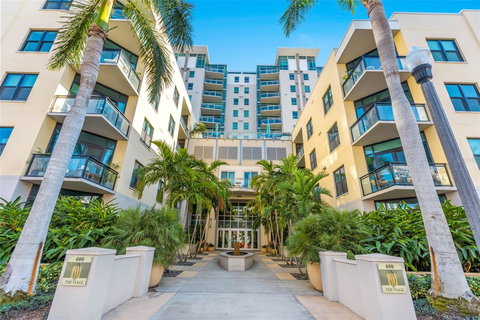 Welcome to the Sage - luxury condo living in the heart of downtown St Pete! Don't miss your chance to own this (2) bedroom (2) bathroom (+ a den) end CORNER unit on the 8th floor that boasts the largest floor plan of the building at 1,493 square feet. When entering the unit, you are greeted with 10 ft ceilings, wide plank engineered hardwood floors, tons of natural light pouring through the floor to ceiling windows and a nice open floor plan. The split bedroom floor plan provides a generous sized guest room with shared guest bath. The primary bedroom presents city views and features a walk-in closet, en-suite bath complete with double vanity, garden tub and walk-in shower. There is also a walk-in laundry room and large custom closet near the entrance providing ample storage space. This floor plan is unique in that it provides a den that is currently being used as an office space. The kitchen offers stunning city views and overlooks the family room, which is perfect for entertaining. The cabinets were resurfaced and backsplash replaced in 2023. Sip your morning coffee or evening cocktail from the large balcony overlooking our beautiful city. All closets in the unit have been customized with shelving and the HVAC was replaced in March 2022. A unique selling point for this unit are the (2) deeded adjacent parking spaces in the covered garage plus plenty of guest parking in front of the building - very rare for downtown living! Another fun fact is that this unit was once the model at the time of build in 2007-2008. The 5th floor amenity level offers residents a resort-style rooftop pool that is both heated and cooled for year-round enjoyment, fitness center, club room and kitchen and outdoor gas grilling station with two grills. Condo fees also include concierge security on site 7 days a week, dry cleaning valet service, FIOS internet, water, sewer, and trash. The Sage is pet friendly, allowing 2 pets with no weight restrictions. There is even a social committee you can be a part of! Located on 4th and 4th in a PRIME location...just a short walk to Publix, Beach Drive sidewalk cafes, a variety of shops and restaurants, the Pier, art galleries and museums. Sports fans will appreciate nearby Tampa Bay Rays and Rowdies. Convenient to USF St Pete Campus, John Hopkins All Children's Hospital, Bayfront Hospital with easy access to I-275 and a 15 minute drive to our award-winning Gulf Beaches. This is the place to be!
