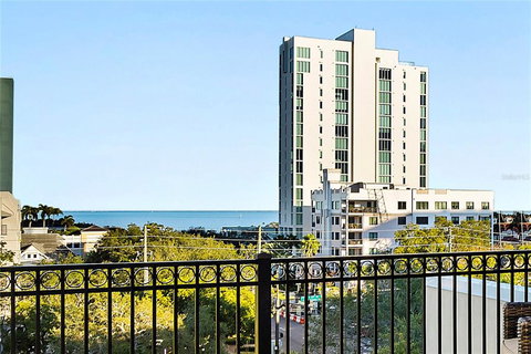 FABULOUS DOWNTOWN TOWNHOME WITH PRIVATE ROOFTOP TERRACE AND WATER VIEWS! Welcome to Regent Lane, a newer built boutique 20-townhome community located in downtown St. Petersburg. This 5-level, 3 bed, 3.5 bath townhome makes living easy with a private residential elevator that goes from your first floor, oversized 2 car garage all the way up to the fourth floor. Floors 2 through 4 offer a spacious living footprint with unparalleled quality and rich finishes thoughtfully curated throughout to reflect modern and contemporary design. The second floor hosts the gourmet chef’s kitchen, living and dining spaces with an open concept floor plan that serves the perfect layout for entertaining in style, along with a 10ft island, stunning level 4 granite countertops, spacious double door pantry, ample solid wood soft close cabinetry with accent under lighting, built in wine cooler, Wolf gas range, Bosch dishwasher and SubZero refrigerator. On the 3rd floor you will find the expansive Owner’s suite which comprises the entire 3rd level and features an oversized walk-in closet, custom en-suite bath with floor to ceiling tile, dual vanities, solid wood soft-close cabinetry and an extra-large walk-in shower with frameless glass shower door, 3 shower heads and built-in bench. Continuing to the 4th floor, you will find 2 guest ensuite bedrooms, both with walk-in closets and located on opposite ends of the floor for optimal privacy. The 4th level also includes a large double door storage closet and a discreet double door laundry closet that features a sink and front-loading Electrolux Washer & Dryer. Now on to the most jaw-dropping feature of this impressive townhome… your spectacular private rooftop terrace! Here you can enjoy breathtaking views of vibrant downtown St. Pete from technicolor sunrises over the Bay to Sunsets that seem to set the sky on fire over the Gulf at night. This ultimate rooftop space has access to electric, natural gas hookup for grilling, water and cable hookups. The Trex composite decking that lines the rooftop floor is beautiful and durable. Your seating options are endless as there is an open trellis covered deck area for shade and an uncovered deck area for sunbathing. Meticulously maintained by the original owner, other notable features include the double pane impact-resistant windows, wide-plank hardwood flooring, 9 ft ceilings, crown molding, plantation shutters and 8’ solid core doors throughout the residence. This exquisite townhome comes with an American Home & Shield warranty through 2024, is solid block construction, not located in a flood zone and comes with a crazy low HOA fee of only $246 per month. This is truly the definition of a “lifestyle by design” residence, where you can live, work and play just steps away from an array of different cuisine options, world-renowned museums, bars & nightlife, sports arenas, waterfront parks, shopping, the New St. Pete Pier and more…