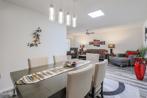GORGEOUS updated unit awaits you in the heart of SCW! Light, bright + plenty of space creates a comfortable home, convenient to shopping, Rec Centers, golf +entertainment! Furniture is included making a perfect turnkey home! Beautiful new living room floors and like new carpeting in all the right places. NEW Windows! Nicely updated kitchen includes GRANITE counters, refaced cabinets with soft close doors with pull out drawers. Kitchen appliances also newer. AZ room has A/C, providing add'l sqft w/easy access to the outdoor patio. Master bedrm is spacious w/ensuite +walk in closet. TONS of storage in garage cabinets.HOA takes care of plenty of maintenance allowing YOU plenty of time to relax, unwind or entertain friends and family! You will NOT want to miss this opportunity!