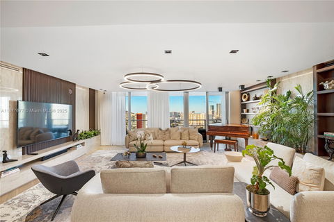 This stunning residence at 330 Sunny Isles Blvd Apt 5-2403 offers unmatched elegance with over $600K in designer upgrades. Featuring custom Italian Mia Cucina doors, Florense closets, panels, and built-ins throughout, the home is both functional and luxurious. The kitchen showcases a unique wood countertop finish, while a refined lighting design with chandeliers and recessed fixtures transforms the ambiance. The master suite was expanded and finished with full marble in the bathroom, custom closets, and a dramatic floor-to-ceiling fabric panel. Additional highlights include automated lighting, AC, curtains, a glass-enclosed family room, linear AC vents, electric blackout and sheer shades, a guest room with a fold-away bed. Every detail has been thoughtfully curated, to a one of a kind apt