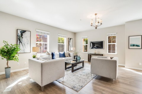 Welcome to the largest floorplan in all of Tasman Crossings, 4 Bedrooms / 3.5 bathrooms / over 2,100 sqft and more, feels like a single family! End unit, with loads of natural light shining through the extra windows! Downstairs bonus room with half bathroom, great for home office or visitors! Open, bright and airy main level with spacious living and dining room! Kitchen is off of dining room, great for easy access while dining! One bedroom and full bathroom on the main living level, great for in-laws! Oversized Owners suite with dual sinks, tub, shower and large walk-in closet. Spacious 2nd and 3rd bedrooms located upstairs, with ample closet space. Laundry room with plenty of storage conveniently located upstairs. Lowest HOA you'll find with Pool, Clubhouse and easy access to greenbelts. 2 car side by side garage. Near Seven Seas park, VTA, Grocery, Dining, Coffee! Easy access to 101, 237, 85. Near Apple, Google, LinkedIn, Amazon, NetApp & other major companies! Don't miss out!