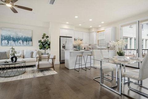 Move in and enjoy this gorgeous, 8 years young, 3 bedroom townhome in Downtown Sunnyvale. Modern and meticulously maintained. Open chef's kitchen with quartz countertops, island and stainless steel appliances. Bright and open kitchen-dining-living design. Gleaming floors. Ground floor bedroom and full bathroom. Large double-pane windows. Multi-zone central A/C. All 3 bedrooms are spacious. Beautiful bathrooms. Two wonderful primary suites with ensuite bathrooms. Inside laundry upstairs. Private paver patio. Detached garage plus large community parking area. Walk to Caltrain, Whole Foods, Target, Philz Coffee, Farmers Market, AMC Theaters, public library and more. Exceptional commute location near Caltrain, El Camino Real, Central Expressway, Lawrence Expressway, Highway 237, Highway 85 and Interstate 101. Easy access to technology company campuses. Wow.