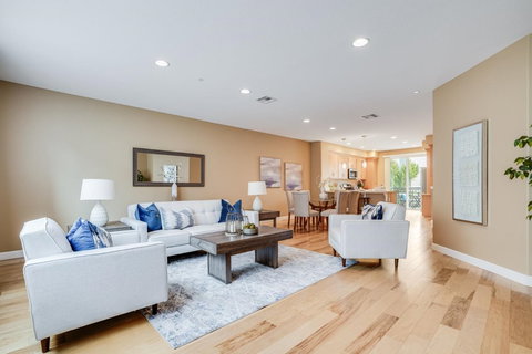 Highly Sought After 4 Bed / 3.5 Bath Fusion Townhome in the heart of Sunnyvale! Largest floor-plan in the community w/endless community amenities only add to the charm of this luxurious home! Private Suite w/patio located downstairs, great for in-laws & visitors. Recessed Lighting, warm paint colors, hardwood floors on main level, plush carpet in bedrooms & more! Formal Entry leading up to the bright Open Living & Dining rm. Gourmet Kitchen w/granite counters, SS appliances, workstation & cozy balcony! Oversized Owners Suite w/WIC, dual sinks & tub! Spacious 3rd & 4th bedrooms located upstairs! Plenty of Storage Space throughout. Attached 2 car side-by-side garage! Low HOA w/theater, clubhouse, fire-pit BBQ area, gym, play area, putting green & more! Easy access to 101 & Lawrence Expressway. Major Companies such as Apple, Google & Amazon nearby! 2 Sunnyvale Parks within walking distance! Close to Groceries, Coffee & Shopping. Loads of major development in the area! Don't miss out!