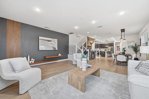 Nestled in the heart of Silicon Valley, this modern townhome community offers the perfect blend of comfort, style, and convenience. This open-concept residence features 4b3.5b, and approximately 2,333 square feet of thoughtfully designed living space. Meticulously maintained and in pristine condition, the home is designed for both everyday comfort and functionality. A private first-floor bedroom suite provides an ideal retreat for guests, multigenerational living, or potential rental income. The second level showcases a spacious open-concept living and dining area anchored by a gourmet kitchen with a generous island, perfect for entertaining. An oversized deck on this level extends the living space outdoors.The top floor offers a luxurious primary suite featuring two large walk-in closets, dual vanities, and a walk-in shower, along with two additional bedrooms, a secondary bathroom, linen storage, and a conveniently located laundry area. Additional highlights include central heating and air conditioning, a tankless water heater, and a two-car garage. Ideally located near major tech employers such as Apple, Google, Amazon, and LinkedIn, with easy access to Highways 101, 237, and Central Expressway, this home delivers effortless commuting and the ultimate Silicon Valley lifestyle.