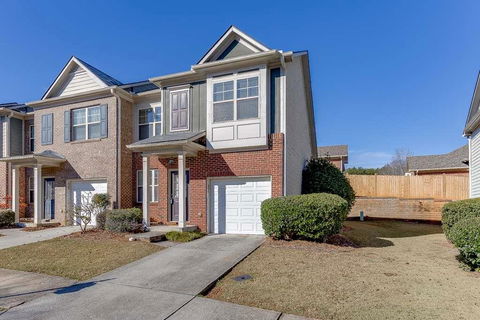 Welcome to this charming end-unit townhome tucked away in the gated Riverdance community-minutes away from everything Suwanee has to offer! Enjoy the perfect blend of privacy and convenience with shopping, restaurants, parks, greenways, top-rated schools, I-85, and State Farm Arena all just minutes away. This two-story home features two bedrooms upstairs, each with its own private bathroom, plus a full bath on the main level-perfect for guests. The layout is comfortable and functional, with the kitchen separating the dining and breakfast areas while still opening nicely to the living room. You'll love the unified black appliances, low maintenance Corian countertops, and easy flow for everyday living. Upstairs includes a laundry closet with washer and dryer already in place, along with a spacious primary bedroom closet and walk-in attic storage access from the primary bathroom-a great bonus for extra storage. Step out back to a private patio that's just the right size for a table, chairs, and relaxing outdoors. Parking is simple with a one-car garage plus an extra driveway spot. The HOA takes care of all yard and exterior maintenance, so low-maintenance living is a breeze. With NO rental restrictions, a strong rental history, and the home currently vacant, this is a fantastic option for both homeowners and investors. Add in fresh interior paint and newly shampooed carpets, and you've got a home that's ready for immediate move-in. Quick close available-don't miss your chance to snag this great Suwanee townhome!