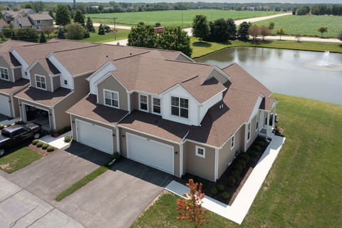 BUILDER'S MODEL FOR SALE! Buy before April 7th and get upgraded fireplace with tile face and homesite premium FREE! 18K in savings! Enjoy Ranch Style Living in this unit WITH a finished basement and full bath included! Dry bar also included in the basement. Need an alternative to Single Family Homes prices? These townhomes live as big as Single Family Homes for Considerably Less! In the beautiful North Grove Crossings Community, these townhomes have waterfront views of the pond. Come for the peaceful views and large living for a fraction of Single Family Home prices! Custom upgrades are ALL AROUND: this model includes upgraded light fixtures, appliances, a tankless water heater (unlimited hot water supply!), backsplash in the kitchen, window treatments, built-in custom closet shelves and organizers, railings on the 1st and 2nd floor, AND a natural gas line to outdoor grill (eliminating the need for propane tanks). EV charger ready in the garage. This END unit is the Hawthorn Floorplan and has a ranch feel with a first floor primary suite.