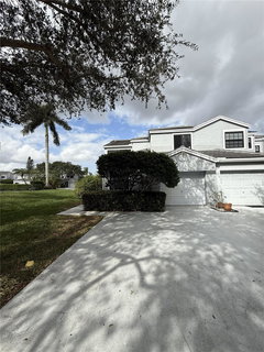 The ground-floor primary suite features an en-suite bathroom with dual sinks, a soaking tub, separate shower, and sliding doors to the screened patio. Additional bedrooms include large walk-in closets. The home also offers a first-floor powder room, extra storage under the stairs, and a modern attached one-car garage. New roof.