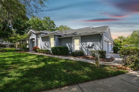 Westmont Oaks is a lovely, tree lined and gated community tucked away minutes from the Westchase entrance. Lowest monthly fee around for so much! Monthly HOA includes Trash, Internet, Cable, Gated Entry, Lawn Maintenance, Roof and Exterior. Blink and you'll miss the turn to this quaint and peaceful villa retreat in the center of it all. Escape from your everyday into a quiet yet vibrant neighborhood with walking paths and a community pool. As you step into the bright and open villa, you'll appreciate the high ceilings and spacious living and dining areas. With countertops and cabinets galore, the kitchen will impress you with the amount of storage space (yes! a pantry too) and room for your most intricate meal prepping. The dinette, with landscaped views, is a sweet spot for meals on the go. The primary bedroom is split from the second bedroom for added privacy. It has a large walk-in closet and connects to the primary bathroom. The primary bathroom includes double sinks, walk in shower, lots of space and a linen closet. The 2nd bedroom has new carpet and is located just around the corner from the secondary hall bathroom. Don't miss the added bonus space perfect for a den, office or playroom. The real star of the show, though, is the exceptionally large (8 x 29) gorgeous, enclosed lanai/sunroom. Ideal for all weather conditions, the screened in windows open/close to meet your needs yet offers protection from the elements. With double fans this space will be enjoyed year-round for entertaining or a daily coffee spot to relax and watch the wildlife. The lovely pond view is a welcome distraction any day of the year. The 2-car garage has storage opportunities with freestanding closets and a screen to let the air in and keep the bugs out. Special added touches to this beautiful home also include fresh paint, plantation shutters throughout the home, ceiling fans, indoor laundry with washer and dryer. Minutes to the Veterans Expressway, Tampa International Airport, multiple malls and trendy "downtown" Westchase is a short drive away. A short drive to fun spots such as Safety Harbor, Palm Harbor, Dunedin and the beaches. Downtown Tampa is approx. 15 minutes away. This desirable villa has been meticulously maintained and is available now!