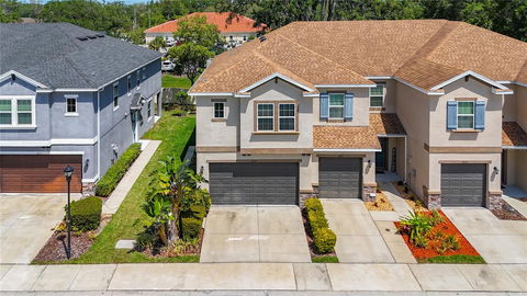 Beautiful pond view from the front in this End Unit townhome with 2-car garage in the Bridge Haven Community, Citrus Park. Walk across the street to the community pool, or enjoy a stroll on the sidewalk lined streets. A well-appointed floorplan design includes an open kitchen/dining/living room combo. Entertain your guests with a large granite island, dining nook, and take in some fresh air in the screen enclosed patio upgrade(2020). Second floor has a loft for home office, library, TV room etc., plus a generous size primary suite w/ walk-in closet, dual sinks and walk-in shower, plus two additional bedrooms joined by a Jack & Jill Bath with Shower/Tub unit. Laundry Room is conveniently located on the second floor and both Washer & Dryer were new in 2020. Access to Veterans Expressway is two minutes away, a short ten minute drive to Tampa International, thirty minutes to the gorgeous beaches of Pinellas County. Make your appointment today!