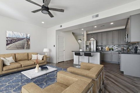 Prime location. Only one of a handful of end units in the community. Quick access to both the 101 and 202 freeways. 3 total parking spaces including a one car garage. 3 oversized bedrooms including an expansive master suite with 4-piece master bath, walk in closet, and outdoor patio. Contemporary finishes throughout including upgraded counter tops, flooring, and lighting fixtures. 3 direct access outdoor livings spaces/balconies. Turn key home. Just a few blocks from Downtown Tempe, ASU, major freeways, Tempe Marketplace, and a 5 minute drive to the airport and Old Town Scottsdale. Low HOAs.