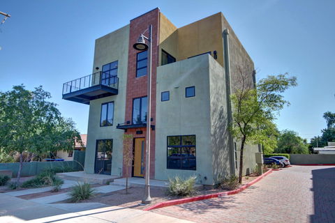 Beautifully designed modern townhome is located in the center of it all! Finishes chosen by a builder with no expense spared! Unique features include floating wood/steel stairs and exposed block construction. Well equipped kitchen boasts Viking appliances, European cabinetry, upgraded fixtures and quartz countertops! Balcony on the second floor to enjoy the gorgeous Arizona sunsets and cool winter nights! End unit! Side by side two car garage. Move in r...