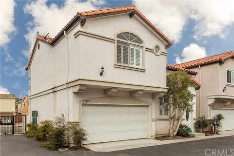 Welcome to this Free Standing Townhouse in a private 18 unit complex in a desirable area of South Torrance. With no common walls, this spacious unit lives and feels like a single family home. The inviting living room with double height ceiling has beautiful plantation shutters. The adjacent great room, dining and kitchen area boasts a beautiful fireplace. A generous sized patio flows out from the great room perfect for dining and family gatherings. Popular white kitchen cabinets with granite counters as well as a peninsula bar complete the comfortable living area. Downstairs also includes a convenient half bath. Upstairs you’ll find the sizeable Master Bedroom with walk in closet and Master Bath with separate shower and oversized tub as well as double sink vanity. Two additional bedrooms, another full bath and separate laundry room are also upstairs. Laminate and tile through out the home. Located in the sought after South High School district (buyer to verify), this end unit is conveniently located near great shopping, restaurants and is a short distance to the beach.