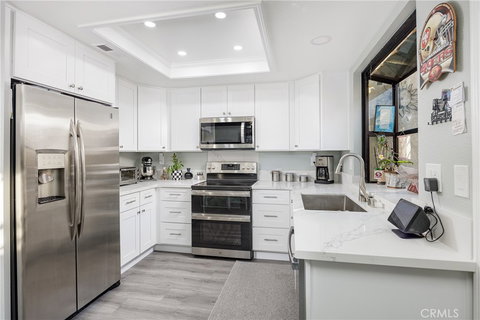 Beautifully upgraded end unit. The lower level has been recently remodeled with plush upgrades. Upgrades include a neutral color palette, vinyl flooring, LED recessed lighting, crown molding, dual-pane windows with plantation shutters, dual pane sliding glass door leading to private patio and garage access, kitchen with white shaker cabinets, soft closing drawers, stainless steel appliances and quartz countertops. Rounding out the lower level is a remodeled powder room and in-unit laundry. The upper level boasts 2 bedrooms and 1 full bathroom with dual vanities. Parking your cars is a breeze with a single-car garage and an assigned off-street parking spot. The sparking community pool and spa are a refreshment from the heat.