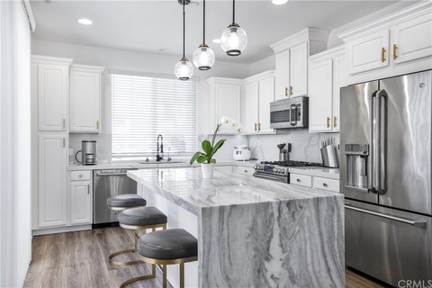 Situated on a meticulously manicured corner lot, this spacious 4BR/3BA, 2,336sqft abode is magnificently fashioned with modern finishes. Explore to discover an open concept living room with custom entertainment system. Enter the sumptuous interior to find an organically flowing floorplan with ample natural lighting, and contemporary color palette. Explore to discover a custom wine room, in addition to a gourmet kitchen featuring granite countertops, upgraded Café stainless-steel appliances, an ultra-modern backsplash, a gas range, a center island w/seating and waterfall edges, and an adjoining dining room. Downstairs includes a bedroom with modern tile bathroom finishes. Enjoy the privacy as you entertain guests in the front patio. For tranquil evenings, the master bedroom is engulfed in remarkable style with a walk-in closet and a dazzling en suite! Two upstairs additional bedrooms are generously sized. Other features: attached 2-car garage, upstairs loft, laundry room w/ sink. Close to shopping, restaurants, & fwys.
