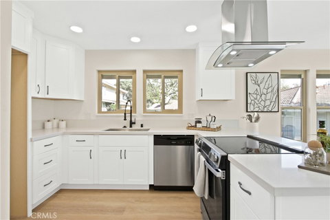 Discover the essence of modern living in this luxuriously remodeled Tustin Home located in the beautiful Laurelwood Community. KITCHEN: Fall in love with the custom-designed kitchen featuring elegant white shaker cabinetry, sleek quartz countertops, slide-in oven, and accented with a stylish range hood. THE PRIMARY SUITE is a tranquil spa-like retreat, with its custom tiled shower, new vanity and champagne fixtures/finishes throughout. This end unit has Tons of natural light emphasizing the crisp and clean detail that flows into each and every room. Additional upgrades include, new vinyl plank flooring and paint throughout, vinyl windows and an HVAC to keep you cool. AMENITIES: Laurelwood HOA features Resort Like amenities with Tennis Courts, Sport Courts, Kid's Playground, Large gated Pool & a Huge Park. Do Not Miss Out ~ Your New Home Awaits! Call to schedule a Showing Today!