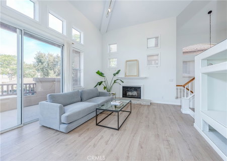 This beautifully remodeled end unit presents an inviting living experience that elegantly combines style and comfort. Offered as the largest floor plan in the community, this home encompasses 1,387 square feet of thoughtfully designed living space with soaring ceilings throughout, two spacious bedrooms, and two modern bathrooms. The airy living room is bathed in natural light with a charming fireplace that creates a cozy, welcoming atmosphere. The contemporary kitchen is a culinary delight, offering generous counter space with modern quartz countertops and an elegant white tile backsplash. Ample cupboard space ensures you have everything you need within reach, while the convenient serve-over bar encourages casual dining and social gatherings. The main level bedroom and bathroom provide flexible living options, and a dedicated private laundry room enhances the home's practicality. Step outside onto the expansive balcony—the largest in the entire complex, spanning 32X7 FEET—where you can unwind amid serene views and fresh air, with convenient access from both the living room and the bedroom. This unit also features a versatile bonus loft, perfect for a home office or creative space, along with the primary bedroom and a full bathroom. Enjoy the convenience of 1 ATTACHED SINGLE-CAR GARAGE AND 1 DETACHED SINGLE-CAR GARAGE WITH STORAGE. Additional upgrades include a state-of-the-art water softener, a Tesla EV wall charger for eco-friendly living, and a new air conditioning and heating system installed in 2024 to guarantee your comfort throughout the seasons. Perfectly situated in a prime location, this home is just a leisurely stroll away from award-winning schools, scenic hiking trails, and beautiful parks. Moreover, the vibrant Tustin Marketplace shopping area is easily accessible, offering a delightful array of dining and retail options. This residence truly encapsulates modern comfort while providing an enviable lifestyle.