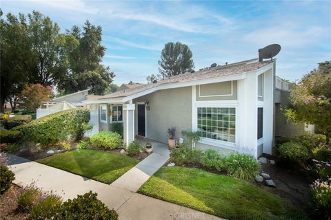 Arrive at this wonderful patio home! An end unit with a gorgeous covered patio overlooking a greenbelt and the pool. It feels like a detached single family home, even though it is attached, because of its location!!! As you arrive at this home, enjoy the luscious landscaping of the grounds and walkway to this precious home. Enter into the large living room that boasts lots of natural light, cozy fireplace, beautiful light fixtures and classy flooring. A full bedroom and master bedroom are conveniently located on the first level. The bathroom on this floor has been remodeled with lots of details such as a walk in shower and lots of stone. To the left, you will find an updated kitchen, complete with updated cabinetry, a breakfast bar, lots of counter space and granite counters. The kitchen overlooks the luscious common gardens, the covered patio and open dining room. Perfect for entertaining. Upstairs, find two more great size bedroom with vaulted ceilings and lots of storage. Both bedrooms share a nice size updated bathroom. Notice the loft area at the top of the stairs that is the perfect office or storage room. The outside patio is a dream. It is large enough for entertaining or a wonderful place to curl up and read a book. This community is a large property which includes a small lake, 3 pools, a playground and more. Centrally located in the heart of Valencia! Close to the mall, great schools, Interstate 5, and more. A must see at a fantastic price!!!