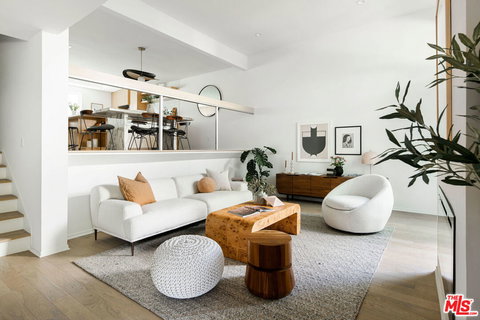 Introducing a meticulously designed tri-level townhome in Marina Del Rey's sought-after Villa Las Trayas community. This stunning residence exudes a combination of Mid-Century and Scandinavian vibes, with clean lines, offering a modern coastal retreat for those seeking the perfect blend of style and convenience. Situated in a garden like setting, this home features an open floor plan. The spacious living area with soaring ceilings, and fireplace in Portola Plaster opens to an enclosed private patio ideal for outdoor dining and entertaining. The gourmet kitchen seamlessly blends functionality and aesthetics, complete with white oak custom cabinetry, stylish finger tile backsplash, and a beautiful center island with open shelf detail. The adjacent dining area provides ample room for entertaining, and is highlighted by a unique mid-century pendant light. Guests will love the mood inspired powder room with imported marble sink and brass finishes. The upstairs includes three well sized bedrooms. The primary bedroom is a true sanctuary, featuring a sunroom that floods the space with superb natural light, an abundance of closet space, and a spa like en-suite bathroom with elevated finishes to include Terrazzo tile. With direct access from the two car garage, this townhome feels like a single family home. Conveniently located with access to Marina shopping centers, running / bike trials, parks, farmers market and the beach!