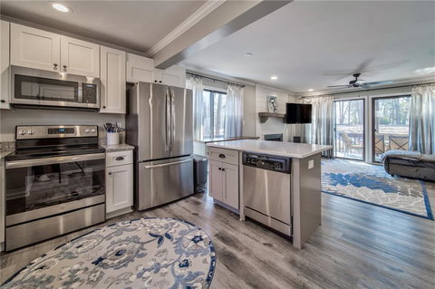 Stunning Renovationof of First Floor Unit! New Kitchen Features White Cabinets, Gorgeous Granite, New Island with Breakfast Bar for Casual Dining and Stainless Appliances. Open Concept Floorplan is Ideal for Entertaining Lake Guests. Beautiful LVP Runs Throughout. The Wood Burning Fireplace has Been Converted to Stylish Electric Logs and Accented with Shiplap for a Nice Custom Touch. Spacious Master Suite Has Room for Lounging and Separate His & Her Closets! Pamper Yourself in the Spa-like Master En Suite with Custom Tile Shower, Seamless Glass Door and Double Vanity. Guest Room can Accomodate a Queen Bed or Two Twin Beds for Overnight Lake Guests. Guest Bath has New White Vanity with Granite and a Tub/Shower Combo. Enoy Relaxing on the Back Deck and Watching the Abundant Wildlife. This Unit is Just Minutes from the Marina and Lakeside Community Pavilion. Boat and Kayak Rentals are Available. Gated Lake & Golf Community with 24 Hour Security. Fabulous Amenities Include Two Swimming Pools, Tennis & PickleBall Courts, Basketball Court, Sand Volleyball Court, Miles of Hiking Trails, Swimming Cove & Clubhouse with Restaurant & Full Bar. Perfect for a Weekend Lake Home or Full-time Home. HOA Maintains the Grounds. Lock and Go Lifestyle!