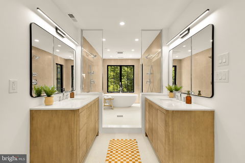 The second level is entirely dedicated to the primary suite, featuring a walk-in closet and a spa-inspired bath with a soaking tub framed beneath oversized windows, dual shower heads, custom oak vanities, and Ann Sacks tile.