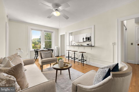 Overlooking Rock Creek Park in the heart of highly sought-after Kalorama, The Rockledge is a quintessential 1923-built brick condominium building straddling the intersection of historic charm and modern convenience. Within this distinguished community is Unit 403, a generously-proportioned one bedroom, one bathroom corner unit flooded with natural light. The front door leads into a dedicated vestibule with a large coat closet, revealing an ethereal home characterized by hardwood flooring, high ceilings, and large windows. The main living area comprises a large open concept space to accommodate lounging and dining needs, set against a picturesque, verdant backdrop. A pass-through and bar top allows for interaction between the kitchen and living area, as well as unlocking additional seating capacity. The kitchen itself has been thoughtfully renovated with contemporary white shaker cabinets, large form tile flooring, granite countertops, and a complete suite of full-size stainless steel appliances. The corner bedroom has natural light streaming in from double casement windows on two walls, and showcases a large walk-in closet with built-in organizers. The convenient ensuite bathroom is lined with subway tile, featuring a modern vanity and shower/tub combination. A designated storage unit conveys with the residence. The Rockledge provides a turnkey lifestyle with a host of thoughtful amenities, including a rooftop terrace with sweeping city views, secure bike storage room, and laundry facilities. Association dues include all common area maintenance as well as heat, water, and disposal. The location is truly unparalleled in its proximity to the nature of Rock Creek, the nightlife of Adams Morgan, and the renowned eateries of the Connecticut Avenue corridor, not to mention public transit. Rich in amenities, comfort, and flawlessly situated, Unit 403 at The Rockledge is an all-encompassing opportunity.