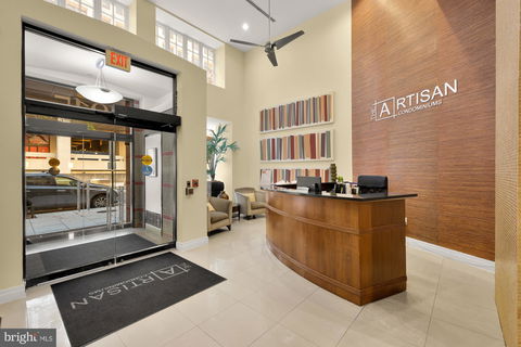This rarely available 2BR+Den/2BA upper floor corner condo features an open concept layout with fifteen total windows affording unparalleled light throughout the day. The beautifully renovated kitchen with stainless steel appliances and white quartzite countertops is a chef’s dream. There is ample space for a separate dining area, a large open living room as well as a coveted den or home office. Each of the two bedrooms features ensuite bathrooms with granite counter tops. The primary bathroom has a separate shower and tub. There are three large walk-in closets plus a separate oversized storage allowing room for everything. Additional features include an in-unit washer/dryer, large balcony, two garage parking spaces and luxury vinyl plank floors throughout. The Artisan condominiums was newly built in 2006, incorporating an historic facade into the beautiful design. Amenities include 24-hour concierge, on-site management, meeting/party room, roof-deck and fitness center. Located centrally in the vibrant Penn Quarter neighborhood steps to restaurants, gyms, shopping, museums, DC monuments and public transportation.