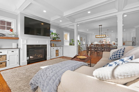 Step into this stunning four-bedroom, four-and-a-half-bath townhome, filled with natural light and designed for modern living. The first floor offers an inviting open-concept space, with a coffered ceiling, elegant wainscoting, and a cozy gas fireplace. The dining area is perfect for hosting, comfortably fitting an eight-person table. The gourmet kitchen is a dream, complete with a spacious center island, high-end finishes, and everything a passionate home chef could want. Upstairs, the serene primary suite boasts a generous walk-in closet and a spa-like ensuite bath with a walk-in shower and double vanity. Two additional bedrooms and a full bath complete the second floor. On the top level, a private guest suite with its own ensuite bath is ideal for visitors. The lower level offers a versatile family room with extra space for a home gym or creative studio. Outside, the expansive fenced-in backyard is a rare find—perfect for gardening, entertaining, or simply unwinding on the patio.
