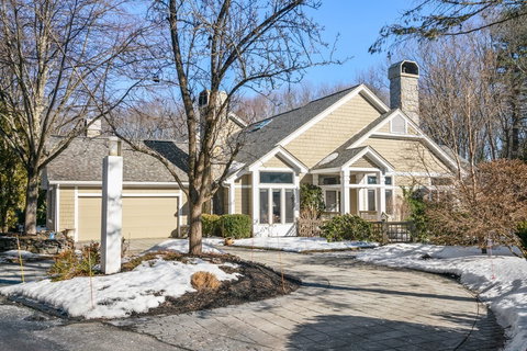 Completely updated luxury townhouse in exclusive gated community offers soaring ceilings, open floor plan, gleaming hardwood & designer finishes. Shingled/gabled/stone chimney home radiates sophisticated charm, with circular driveway & lushly landscaped fenced entry garden. Breathtaking vaulted foyer has exquisite columns/molding & flows into wonderful entertaining space. Formal living room with fireplace/floor-to-ceiling windows, dining room with glass doors to deck/tranquil woodland views, study with textured glass doors/fireplace, designer eat-in kitchen, top appliances/stone counters/island/wet bar/wine fridge & mudroom to 2-car garage. Serene master features window-lined sitting area/private deck & marble spa bath, additional en suite bedroom has patio. Gorgeous wrought iron staircase with a tower-like skylight leads to expansive walk-out lower level bonus space with media/game rooms, full bath, gym & office. Enjoy association pool, prime access to commuter routes