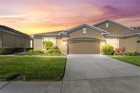One or more photo(s) has been virtually staged. Welcome to your dream home! This meticulously maintained and move-in ready Tarragon villa model by Lennar boasts 3 bedrooms, 2.5 bathrooms, and a den with over 2,030 sq. ft. of generous living space. Situated in the exclusive and highly sought-after maintenance-free gated Lettingwell village of Meadow Pointe, this home offers modern upgrades and tasteful updates throughout. The stunning gourmet kitchen features wood cabinets with up and down lighting, beautiful backsplash, large pantry, breakfast bar, and state-of-the-art stainless steel appliances, including a gas stove for the discerning chef. The unique floor plan includes a large den with an added closet that can be used as an office, media room, or a 4th bedroom. The Tarragon model perfectly blends elegance with functional living space, featuring an all-concrete block, one-story layout with an open floorplan, ample natural light, and a spacious master suite with an ensuite spa-like bath with dual sinks, garden tub, large separate shower, spacious his and hers walk-in closets, and a French door leading to the lanai area. French doors off the living room open to a huge extended covered, screened lanai and a fully fenced yard offering picturesque views for quiet evenings of relaxing with a book or a glass of wine while enjoying the Florida sunsets. Other upgrades and special touches in the home include a water softener system, LG top-load washer and front-load dryer, newer high-efficiency AC system, French drains, and hurricane shutters. The Lettingwell village within Meadow Pointe has very low HOA fees which include lawn and landscaping, exterior painting, and roof replacement. The community of Meadow Pointe offers many amenities, including multiple clubhouses, fitness centers, a community pool with a splash pad, tennis and basketball courts, and playgrounds. Located just minutes from Wiregrass Mall, Tampa Premium Outlets, "A" rated schools, and I-75 for easy access to all areas of Tampa Bay and beyond, this community is ideal for families looking to find the perfect home in a quiet family-oriented atmosphere. Priced to sell fast, and the seller is offering a FREE one-year Home Warranty! Why are you still reading this?? CALL NOW to schedule your private tour of this amazing home before it’s too late!