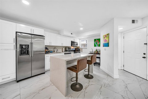Step inside to find beautifully updated bathrooms, new floors throughout providing a fresh & contemporary feel. The kitchen is a chef's dream, featuring a quartz island countertop that makes meal preparation & entertaining a breeze.