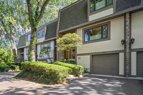 A lovely townhouse that lives like a single family home! Enter from the elevated porch into the second (main) level. There is a renovated sunny, eat-in kitchen with white shaker cabinets and quartz counter tops, top-line appliances, LED lighting, ample storage and recessed pantry. Hardwood floors through out kitchen, dining and living rooms. Extra closets in the living room that be opened and incorporated into the already good desk/card table area or make a great library. Upstairs you will find 3 large bedrooms, updated baths and multi-function room darkening shades. Primary en-suite bath features heated floors, soaking tub, separate shower, double vanity and Grohe fixtures. Ground/first floor has an excellent sized family room/den with remote control gas fireplace and bamboo flooring. Walk out the sliding doors to you own landscaped yard and patio. Also, on this level is a laundry room with hanging space and a newer bathroom on as well as an attached garage. Newer windows throughout and new roof. Guest parking. Just under 2300 sq ft.