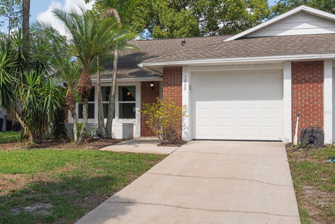 Beautiful, fully renovated ½ duplex in Aloma Park. New ROOF 2018. New A/C 2016. Upgrades include granite in kitchen and bathrooms; gorgeous maple cabinets in both areas; new tile in whole house, herringbone style; new shower and bath wall tiles, new fans with lights and all bathrooms handicap accessible. The kitchen has lots of storage, with drawers and a closet pantry. Not only are the counters granite, but the backsplash is also granite. The primary bath has two sinks and shower only. There are French doors with built in blinds to the back screened lanai, one in the primary bedroom and one from the kitchen. The ceiling of the lanai has been insulated and electric is available if buyer wishes to put up fans. Back yard is large and nicely landscaped. In the front and the back yard there are numerous fruit trees including: mango, avocado, banana, orange, cherry and guava. It has a deep well for irrigation. This community has tennis courts, clubhouse and a swimming pool. It is located just off Aloma and only minutes to all shopping and eating as well as the 417. House may be under audio/video surveillance.