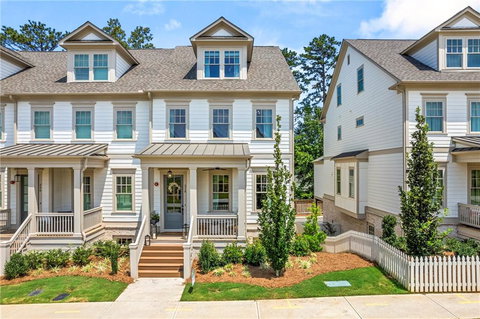Welcome to this beautiful end unit townhome at The South on Main, bathed in natural light and ideally positioned near the community pavilion and green space. Step inside and be greeted by gorgeous hardwood flooring, upgraded trim, and updated light fixtures throughout. The kitchen features quartz countertops, tile backsplash, custom white cabinets and sleek stainless-steel appliances. The generously sized island houses a convenient sink, while all cabinets in the home have a soft closing mechanism. The vaulted ceiling in the keeping room has dark wood beams, creating an inviting ambiance. The owner's suite is a true retreat, offering a one of a kind accent wall, spacious layout with a luxurious free-standing soaking tub and a separate fully tiled shower. Dual vanities, two walk-in closets, and a linen closet provide ample storage space. Adjacent to the owner's suite and secondary bedroom is a well-appointed laundry room with custom built-in bookshelves in the wide hallway. Additionally, the fourth floor provides a versatile space, perfect for a bonus, media, fitness, lounge, or home office room, tailored to your lifestyle needs. The fully finished basement is a bright and inviting space with LVT flooring and abundant natural light. The option for an elevator installation is available. The South on Main community is rich in amenities, including a play area, dog park, and a walking trail that leads directly to the charming restaurants and shops of downtown Woodstock.