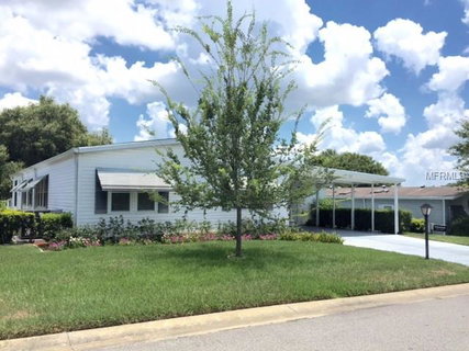 55 plus, resident owned, gated, golf course community. Beautiful golf course frontage on the 8th fairway, with huge oak tree for shade. 3 bedroom, 2 bath, Palm Harbor built. Almost 2,000 heated square footage. Split bedrooms, drywall, laminate flooring. Eat-in kitchen with separate laundry room, plus glass sliders to two screened lanais. Both rooms boost great golf views and one has vinyl windows for year round use. Master has garden tub and shower. Oversized carport with room for at least 6 vehicles. Golf cart garage with additional workspace and its own a/c.